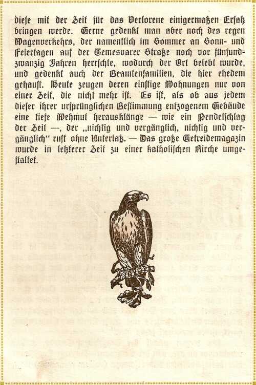 Se vorbește despre ceea ce a însemnat șoseaua spre Timișoara, înlocuită acum de calea ferată. Oamenii îsi amintesc cu nostalgie de convoaiele de căruțe cu coviltir care, în urmă cu doar 25 de ani, dominau șoseaua Își mai amintesc de familiile funcționarilor stăpânirii, care îsi făcusera aici un trai. Astăzi doar locuințele lor ne mai amintesc despre vremuri care nu mai sunt. Este ca și când din aceste clădiri golite de destinația lor inițială, o adâncă melancolie răzbate - ca o bătaie de pendul a timpului - care repetă fără încetare: "deșart și trecător, deșart și trecător". Iar marea magazie de cereale a fost transformată în ultimul timp în biserică catolică.