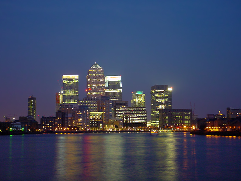 | Canary Wharf at night. You can see the 3 tallest towers in the middle (HSBC, One Canada Square, Citigroup) and on the right a resedential tower under construction. On the left are the recently completed Bank Street towers. Photo taken by Chest, of SkyscraperCity Forums. | ||||||||||||||||||||||
