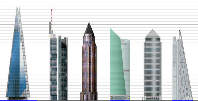 | Diagram of how big London Bridge Tower will be in comparison with Europe's other tallest buildings. Shown below from left to right are: LBT, Commerzbank (Frankfurt), Messerturm (Frankfurt), Columbus tower (London - proposed), One Canada Square (London), 122 Leadenhall street (London - proposed). |
