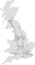 Firstly, the M74 and A74(M) are infact the same road - the northern (older) part is known as the M74, whereas the newer southern section, completed in the 1990s, is the A74(M). The road begins at Gretna in southern Scotland, terminating off the A74 ( which is now just the Carlisle - Gretna road, but the A74 was formerly the Carlisle - Glasgow road). The motorway currently finishes abrubtly in the southern suburbs of Glasgow. However, plans are afoot to extend the M74 to join the M8 near the M77 junction.