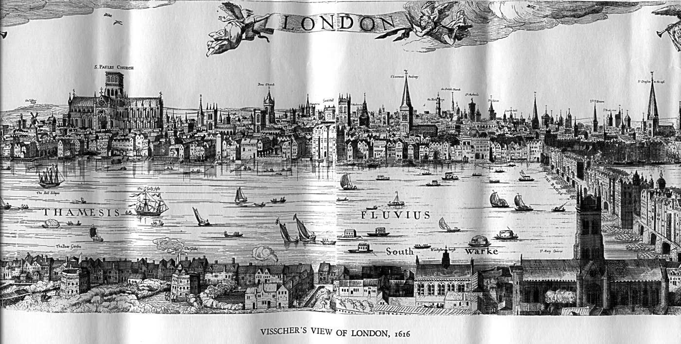 | The picture below depicts how London looked in 1616. Saint Paul's cathedral can be sighted to the left of the picture, and Old London Bridge on the right. |