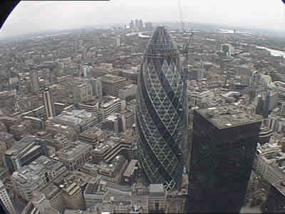 | The Swiss Re tower, also known as 30 St. Mary Axe (its street address) and the Gherkin (especially by the press - due to its shape), is perhaps the most notable piece of contemporay architecture in London. The tower rises to 180 metres (590 feet), and is the second tallest building in London's central business district, The City. The skyscraper was designed by Norman Foster architects, one of the most well-known British architect firms. At the very top of the tower is a restaurant, accessable only to people who work in the building. The photo on the left shows the tower in July 2003, with one crane remaining on the tower. Below is how the tower looked on the 20th December, externally complete, with no cranes remaining. |