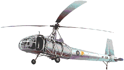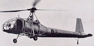 This experimental design had a three-bladed rotor and torque was compensated for by a jet thrust arrangement at the end of the fuse-lage. The air from a multi-bladed fan which cooled the engine was ducted through the inside of the fuselage, heated by the exhaust gases and then ejected through an opening on the port side. Two hori-zontal shutters controlled the flow of this air. The controllable efflux was also used to impart turning movements to the rotorcraft, which had neither fin nor rudder. The multi-bladed variable-pitch fan was coupled to the rudder pedals and thus provided yawing control. |