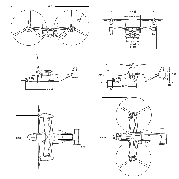 e instalación de los motores. Esta máquina estaría potenciada por dos motores Allison T406-AD-400 que moverían cada uno a tres palas de 38 pies de diámetro (11,58 metros)del rotor, ubicados sobre una envergadura alar de 45 pies (13,71 metros). Cada motor, tiene una potencia de despegue de 6150 shp y un máximo continuo de 5890. La transmisión está limitada a 5000 shp para operación normal, pero para cerca de 6000 shp para casos de emergencias. El Osprey realizó su vuelo inaugural el 19 de marzo de 1989 y su primera transición el 14 de septiembre de 1989. Posee una capacidad de transportar a 24 soldados ó una carga de 864 pies cúbicos. Una rampa de carga se encuentra ubicada en la cola del fuselaje de 57 pies de largo. El peso para el despegue vertical es de hasta 47500 libras (21545 Kg.), mientras que el peso máximo para despegues cortos y aterrizajes puede superar las 60000 libras (27215 Kg.), incluidas 20000 libras (9071 Kg.) de carga interna o externa. El alcance de combate es de 600 millas, con un máximo de un tanque ferry de 2400 millas. La velocidad máxima puede alcanzar los 350 nudos. Para finales de 1996, se habían volado mas de 1100 horas de vuelos de prueba, realizadas con cinco prototipos; dos aeronaves se accidentaron (1991 y 1992), la última cobrando la vida a 7 personas. La primer aeronave de las cuatro “representantes de producción” comenzaron a volar el 5 de febrero de 1997. Se espera que sean construidas un total de 523 aeronaves. VERSIONES