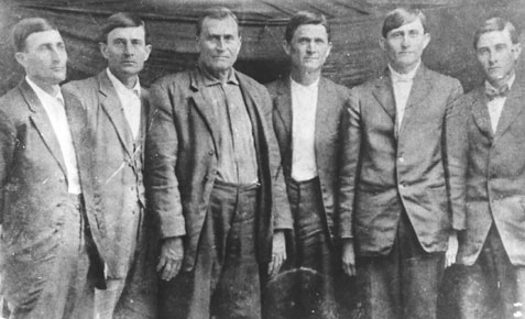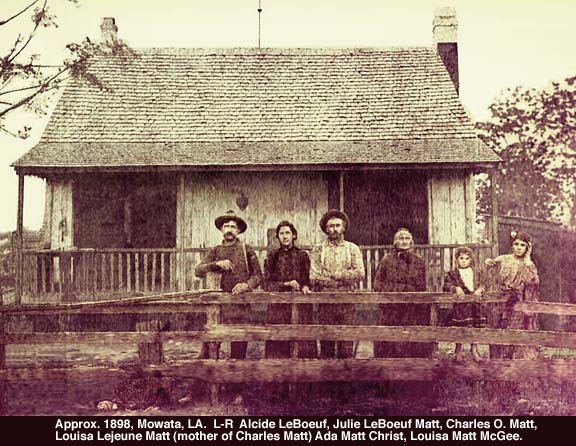 Ada's uncle Jim Matt and his sons. Left to right: Onesime Matt, Eugene Matt, Jim Matt (father), Eulgire Matt (sp?), Israel Matt, Valentine Matt. Grand Coulee, Louisiana probably 1920s.