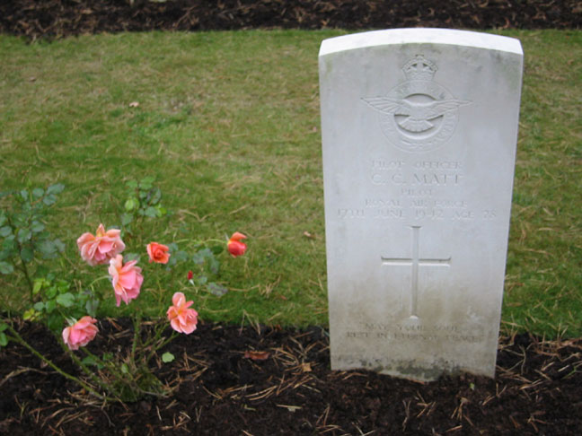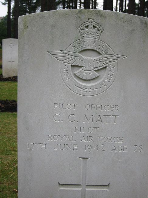 Cleveland Charles Matt (C.C.), the brother of Father Wilson Matt and son of Uncle A.C., joined the Royal Air Force volunteer reserve as a pilot officer of the 245th Squadron (Rhodesian) before Pearl Harbor. He was shot down over Dover at age 28. He is buried in the RAF section of Brookwood Cemetery in Sussex, England. (Here is Alice Winn at his grave.)