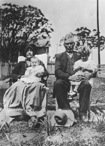 Julia LeBoeuf Matt and Charles Matt(Grandma and Grandpa Christ), with Louisa Matt McGee's children Bennie and Audrey McGee, Eunice, Louisiana about 1920