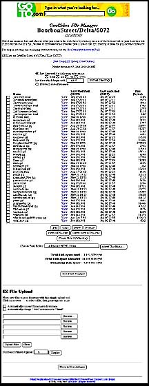 The next page, GeocitiesFileManager, when completely finished loading, will contain all the files that make this website appear. The files with .html suffixes are the actual pages, all the rest are images. ( I put an _ underscore in front of the html files so that (almost) all the pages would appear together) Underneath the list of files is the EZupload area for uploading your jpg image files. Here is one version of the Yahoo!/GeoCities File Manager webpage: