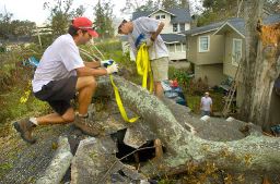 | Chris Ieyoub, left, and Gerry Obluda work on Wednesday atop the roof of a Lake Charles house pierced in several places by the toppling of a large oak tree during Hurricane Rita. Owner Steve Cochran and a small crew of friends worked on the tree for several hours, cutting branches off before pulling the huge trunk off the house with a strap, rope and truck |
