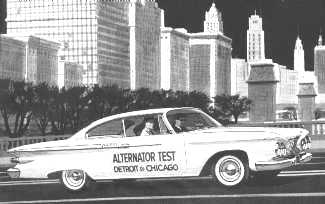Un Plymouth 1961 va desde Detroit a Chicago en un viaje de 5 1/2 horas y 527 km, sin batería, para probar el nuevo alternador, inventado por Chrysler.