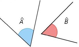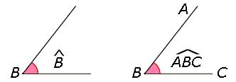 b) con tres letras mayúsculas y el símbolo ^ encima: las dos letras de los extremos representan a los lados y la de en medio al vértice.