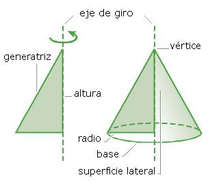 El cucurucho de un helado y el tejado de una choza son ejemplos de conos. El cono se forma al girar un triángulo rectángulo alrededor de uno de sus catetos. Los elementos del cono son: