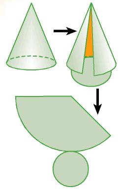 Si cortamos el cono por su superficie lateral, siguiendo la generatriz, y por el borde de su base, y lo extendemos sobre una superficie plana, obtenemos su desarrollo: