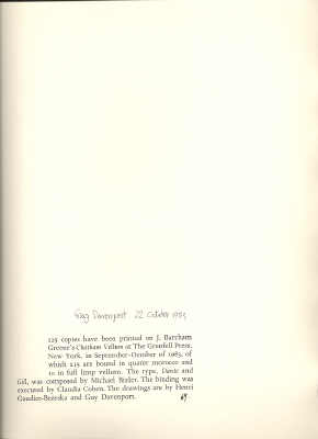 125 copies have been printed on J. Barcham Greene's Chatham Vellum at The Grenfell Press, New York, in September-October of 1983, of which 115 are bound in quater [sic] morocco and 10 in full limp vellum. The type, Dante and Gill, was composed by Michael Bixler. The binding was executed by Claudia Cohen. The drawings are by Henri Gaudier-Brzeska and Guy Davenport. [copy 69 inked in] (colophon) Signed: Guy Davenport 22 October 1983