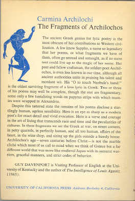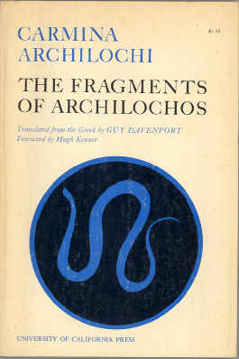 Carmina Archilochi. The Fragments of Archilochos. Translated from the Greek by Guy Davenport. Foreword by Hugh Kenner. Berkeley, CA: University of California Press, 1964. Paperbound edition. Cal 92.