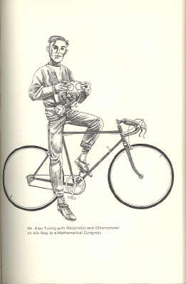 Professor Davenport asked me to serve as a model for his drawing of Alan Turing. I visited the Professor's apartment one fall morning 1967. I straddled a bicycle with an alarm clock (upside down) strung about my neck. As I recall that day, GD while talking about Turing, worked quickly sketching trouser folds and the tilt of my head.