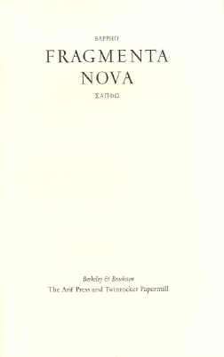 "The Arif Press of Berkeley, California and Twinrocker Handmade Papers of Brookston, Indiana are pleased to announce the publication of Fragmenta Nova; being a group of newly identified fragments of the seventh-century BC Greek poet Sappho. The issuance of these six poems supplements and brings up to date her œuvre as represented by the Oxford University Press edition of 1955.