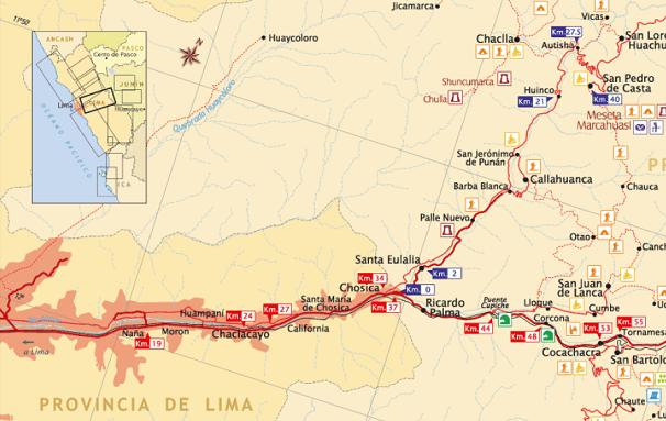 Callahuanca. Ubicacion: 50km al este de Lima Duración: Todo el día. Nivel 3. Abril a Noviembre Distancia total aproximada: 43 km Rango de altitud: 851 – 1760 msnm Viaje en bici por el valle medio del río Rímac. Empieza en Chosica, el inicio es un corto tramo por la carretera central, siguiendo por el desvío a Santa Eulalia y el resto por camino de trocha afirmada, pasando por la Central Hidroeléctrica Barba Blanca, de aquí sigue una corta pero fuerte subida hasta Callahuanca, tranquilo pueblo de agricultores y buena fruta. Regresamos al camino principal por San Jerónimo de Punán. Sol, aire puro, naturaleza, relax, paisajes, comida típica, río, buen clima, libertad. De Lima a Chosica ida y vuelta en vehículo privado. 1 day tour Callahuanca. Location: 50 km east of Lima uration:Full day. Level 2. April to November Approximate total distance: 43 km Altitude range: 851 – 1760 masl Nice bike ride by the mid Rímac river valley. Start at Chosica, the begining is a short section by the Central Highway, following the detour toward Santa Eulalia, the rest by a trail passing by the Barba Blanca hydroelectric power plant, from here follows a short but steep ascent up to Callahuanca, a tranquil town of farmers and good fruti. Return via San jerónimo de Punán. Sun, pure air, nature, relax, landscapes, local cuisine dishes, river, good climate, freedom. From Lima to Chosica, round trip by private car. |