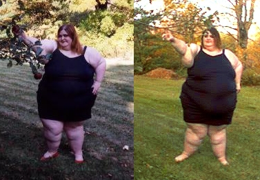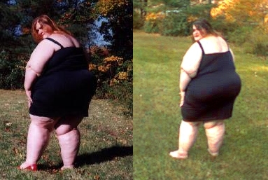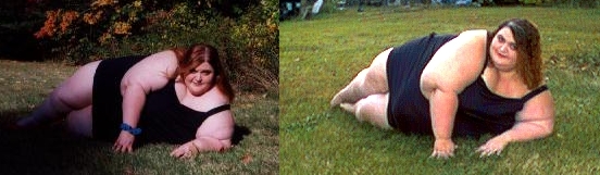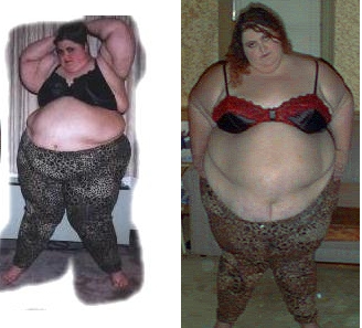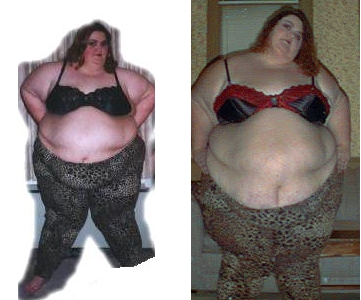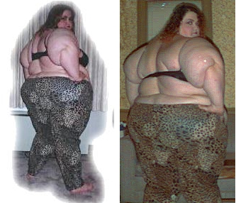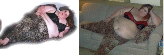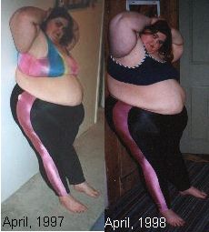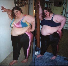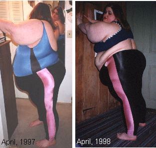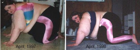 I realize the angles are not the same, nor are all the poses. We did the current shots quickly, right before we had to go out, so they are not exact copies. Also, the top I am wearing is different (I couldn't find the one I used a year ago). All the pics on the left hand side were taken in July of 1997 at approx. 480 lbs. The pics on the right were taken in early October, 1998 at 520 lbs. The current shots were taken with our new digital camera. It's not the best camera around, but I think it did o.k.