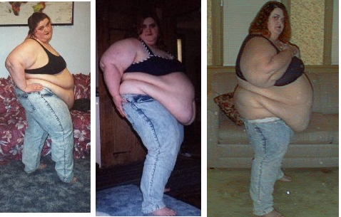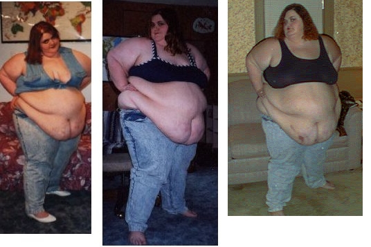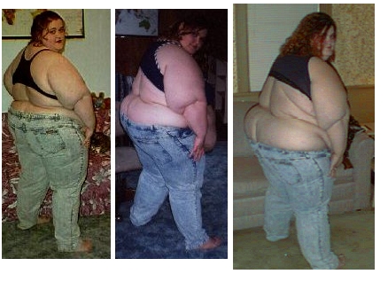 The pics on the left were taken in February '97 (apprx. 440 lbs), the middle pics were done in December '97 (apprx. 490 lbs.) and the ones on the right were taken in October '98 (around 520 lbs.) No matter how hard my husband and I tried, we couldn't get the jeans up any higher.