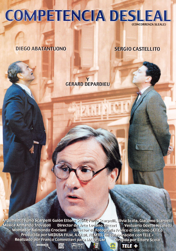 PROXECCIÓN SUSPENDIDA A CAUSA DAS OBRAS DE INSTALACIÓN ELÉCTRICA NO SALÓN DE ACTOS. A PROGRAMACIÓN REINICIARASE O 20 DE MARZO DESCULPADE AS MOLESTIAS Xoves, 13 de marzo de 2003 20,30 e 23 h. ESTREA EN OURENSE Salón de Actos da Biblioteca Pública (rúa Concello 11) COMPETENCIA DESLEAL Concorrenza sleale. Italia-Francia, 2001. Cor, 110 min. Director: Ettore Scola Producción: Franco Committeri (Medusa Produzione, Les Films Alain Sarde, France 3 Cinéma) Guión: Fulvio, Furio e Giacomo Scarpelli, Ettore e Silvia Scola Fotografía: Franco di Giacomo Música: Armando Trovajoli Montaxe: Raimondo Crociani Intérpretes: Diego Abatantuono, Sergio Castellitto, Gérard Depardieu, Claude Rich, Jean-Claude Brialy Data de estrea en España: 13-09-2002 Versión orixinal con subtítulos en castelán. Premios David de Donatello 2001: mellor deseño de producción Moscú 2001: Premio de prata ao mellor director Umberto é o propietario dunha elegante xastrería que está perdendo clientes a favor do seu competidor, un xudeu chamado Leone. Sen embargo, a outro nivel as familias se levan ben: os fillos pequenos de ambos son compañeiros de clase e inseparables amigos, e os fillos maiores son noivos. Pero a aprobación das «leis raciais» en 1938 dan ao traste con todo.