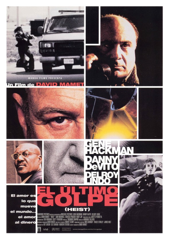 5 de febreiro de 2004 20.30 e 23 h. Heist. EE UU-Canadá, 2001. Cor, 111 min • Dirección e guión: David Mamet • Produción: Art Linson, Elie Samaha, Andrew Stevens (Heightened Productions, Indelible Pictures, Morgan Creek Productions, Franchise Pictures, Warner Bros, Stolen Film Productions) • Fotografía: Robert Elswit • Montaxe: Barbara Tulliver • Música: Theodore Shapiro • Intérpretes: Gene Hackman, Danny DeVito, Delroy Lindo, Sam Rockwell, Rebecca Pidgeon, Ricky Jay, Patty Lupone • Data de estrea en España: 11-04-2003 • Versión orixinal con subtítulos en castelán. • Web oficial: http://www.mangafilms.es/elultimogolpe • Web oficial (inglés): http://www.heist-movie.com Joe Moore ten como esposa unha muller nova e atractiva, varias persoas débenlle diñeiro, e ademais ten un traballo que lle encanta. É ladrón. A súa vida vese trastocada cando unha inoportuna cámara de vídeo de seguridade o filma en pleno choio. O seu encubridor e comprador de obxectos roubados, Bergman, négase a pagarlle o diñeiro que lle debe, e é probábel que a súa esposa estea enganándoo co xove lugartenente de dito perista. Moore e o seu colega habitual, Bobby Blane, así como o seu cómplice Pinky Pincus, encóntranse de súpeto na ruína, traizoados e chantaxeados. Moore vese obrigado a xuntar de novo o seu equipo coa intención de dar un último golpe para Bergman.