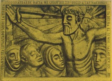 Judíos". La escribió o la mandó escribir, el propio Pilato, que, al tomarse este desquite contra sus odiados instigadores, los jefes espirituales de aquel pueblo al que habían hecho gritar en su presencia: "¡No tenemos otro Rey más que el César!", vino a ser, burla burlando, el pregonero oficial de la realeza de Cristo. Si un artista quisiera representar la crucifixión del Señor en toda su horrenda realidad, produciría una obra que no podrían soportar los ojos ni el corazón. La Cruz no era sólo un instrumento de muerte, sino una manera de ajusticiar a un ex hombre, infiriéndole, al mismo tiempo, la mayor infamia y haciéndole sufrir el mayor tormento. Con razón Cicerón la llamó "cosa nefanda", y "el más cruel y tétrico suplicio". Jesús la sufrió en toda su tremenda realidad; pero, con su muerte en ella, la ennobleció, convirtiéndola en un lábaro de triúnfo, en un símbolo de paz y de amor, de esperanza y de consuelo, y en su trono de gloria. Sentado en ella, como en su cátedra, está el Maestro de los hombres. Subido a ella, como a su altar, está el Sumo Eterno Sacerdote. Instalado en ella, como en su trono, está el Rey inmortal de los siglos, el Rey de la Eterna Verdad, Rey del Cielo y de la Tierra, dando el supremo testimonio de su Divina Realeza. Inútilmente le dirán en son de burla: "si eres el Cristo, el Rey de Israel desciende de la Cruz" (2). Tanto importaba invitarlo a que renunciara, en aquel instante supremo, al fin logrado de su Encarnación misma. "Yo para esto nací y para esto vine al mundo, para dar testimonio de la Verdad" (3), había dicho él, pocas horas antes, a Pilato, y agregó entonces esto otro: "Todo aquel que es de la Verdad escucha mi Voz". (4) Bien sabía él las sed de verdad que embarga a los hombres, a quienes perdió el que es llamado, por antonomasia, "padre de la mentira"; por eso pudo anunciar, en vida, proféticamente: "Cuando sea levantado sobre la tierra, todo lo atraeré hacia mí" (5). Los hombres apetecen y buscan la verdad, como el pan el hambriento, como el agua el sediento, y su gran tragedia consiste en haber creído hallarla en quienes se la han mentido. Uno solo, sin embargo, ha amado de verdad a los hombres, como que dió su vida por salvarlos: Cristo. Uno solo ha dicho la verdad a los hombres, como que Él mismo es la Verdad Sustancial y Eterna que bajó del Cielo: Cristo. Uno solo ha enseñado a los hombres la verdadera justicia y el verdadero amor: Cristo. uno solo ha traído a los hombres la verdadera libertad, la libertad sublime de los hijos de Dios: Cristo. Por eso su cuerpo Santísimo enarbolado en la Cruz, es bandera de gloria pata todos los hombres que, porque "son de la Verdad y escuchan su voz" oponen al grito apóstata: "No queremos que Éste reine sobre nosotros" (6), el grito fiel que resuena en el mundo desde hace veinte siglos: "¡No queremos otro Rey, sino Cristo!". Este grito es el que oyó, y aquella bandera es la que vió David, cuando con exaltación y gozo, dijo en el Salmo XCV: "Decid a las naciones que ya reina el Señor", y esta misma es la versión triunfal que mueve a la Iglesia a exclamar en su Liturgia: "Regnávit a ligno Deus!": "¡Reinó Dios desde la Cruz!" (1) Isaías, LIII, 12. (2) S. Marcos, XVI, 32. (3) S. Juan, XVIII, 37. (4) S. Juan, XVIII, 37. (5) S. Lucas, XII, 32. (6) S. Lucas, XIX, 14. Nota: La admiración y el afecto que el artista siente por Su Eminencia Rvma. el Sr. Cardenal Dr. Antonio Caggiano, Obispo del Rosario, lo ha inducido a modelar en este cuadro el rostro del Apóstol San Juan con las facciones del mismo Emmo. Sr. Cardenal, perfectamente logradas. |