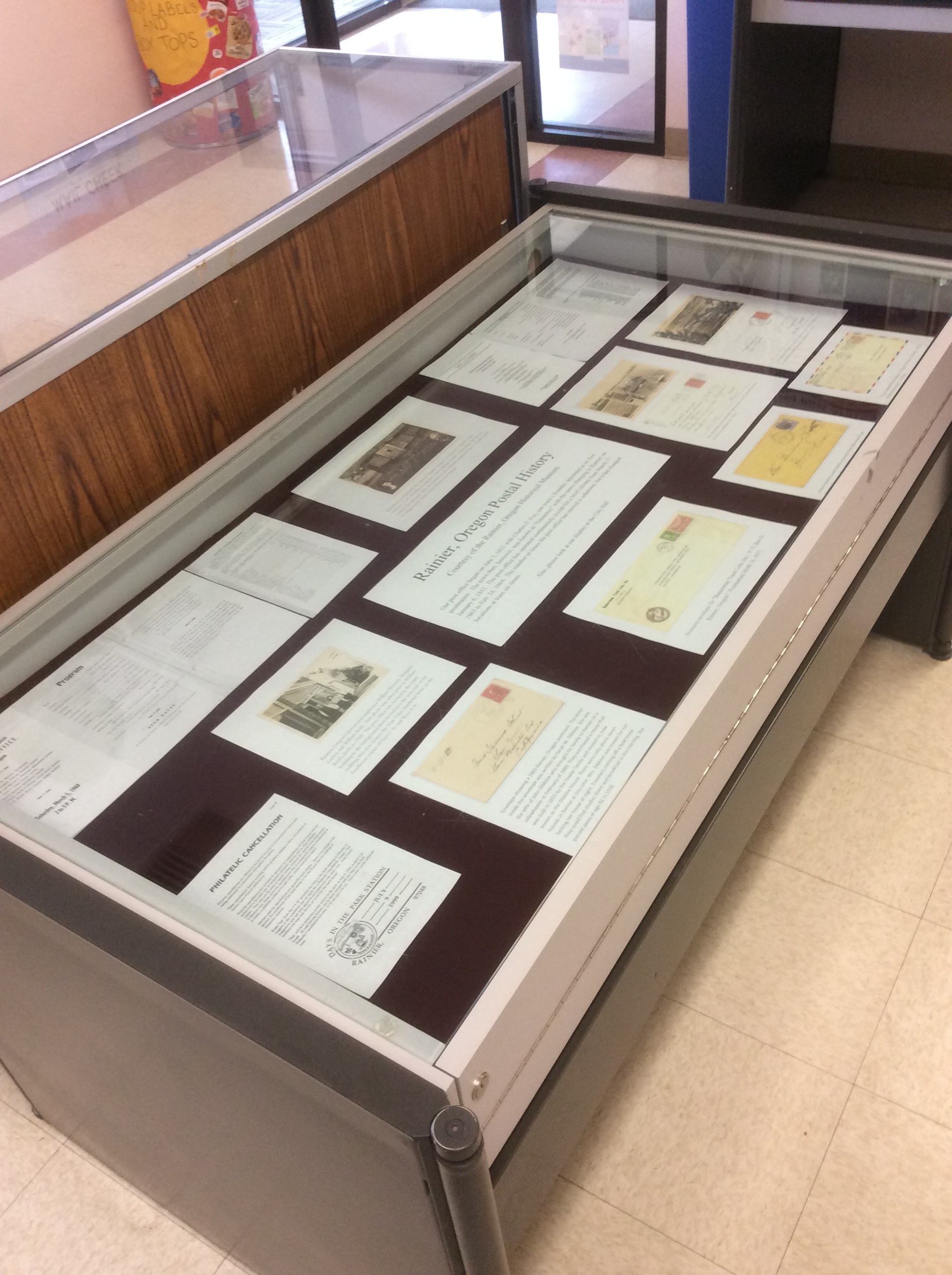 On March 1, 2016 we added a display of Rainier, Oregon postal history at the Rainier post office. We would like to express our gratitude to the Rainier Post Office for letting us use their display case. |