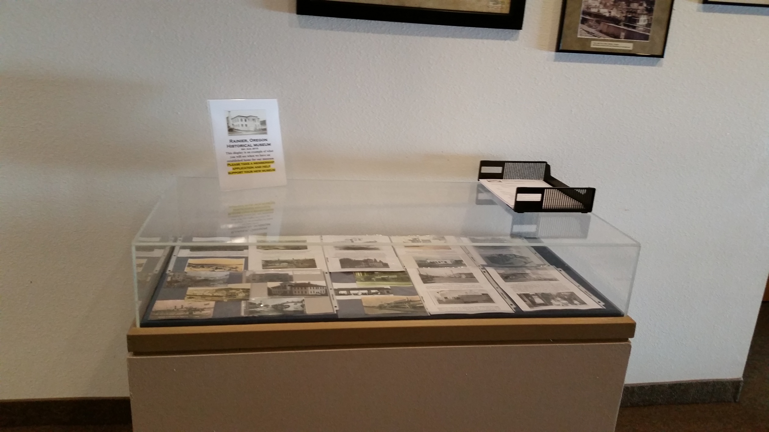 Our new display case at the Rainier, OR City Hall, February 2016. Everyone helped but it was Judy Doving that did most of the work painting the base, cleaning the top and arranging the display that Kay Heflin had printed and mailed to her from her snowbird getaway. |