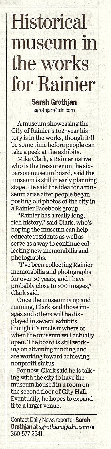 "Historical museum in the works for Rainier." Written by Sarah Grothjan for the Longview (WA) Daily News December 6, 2015. |