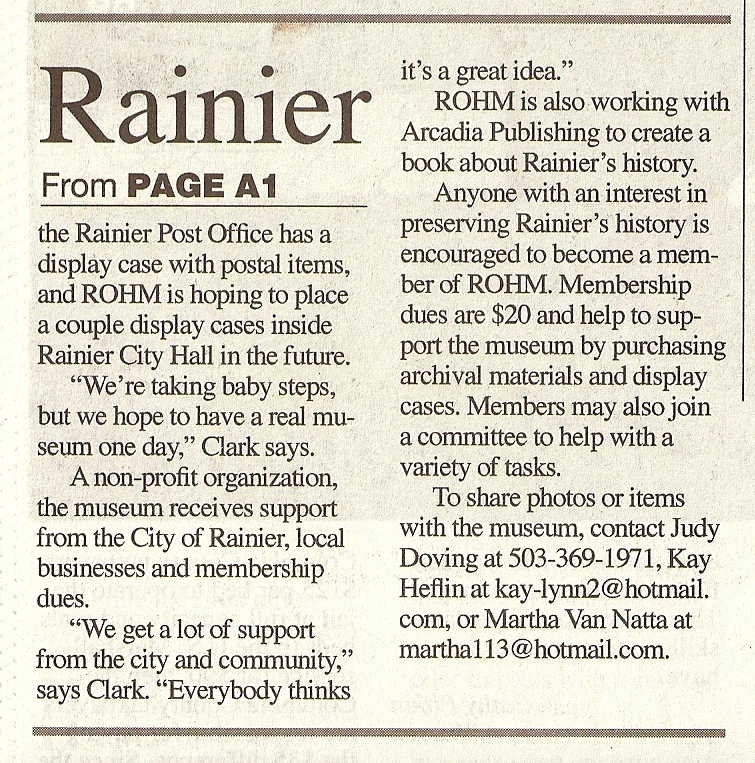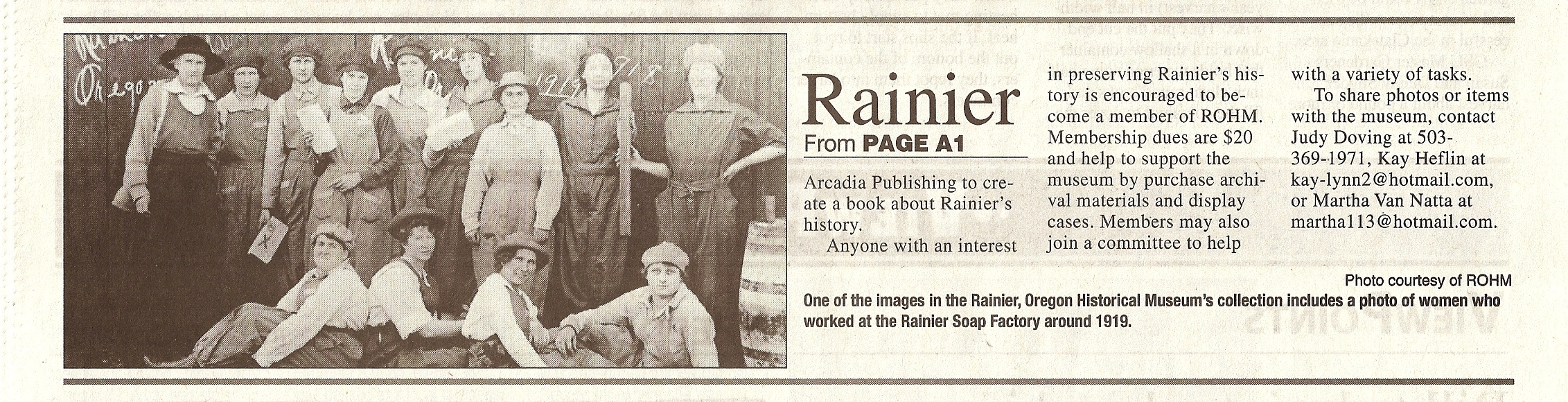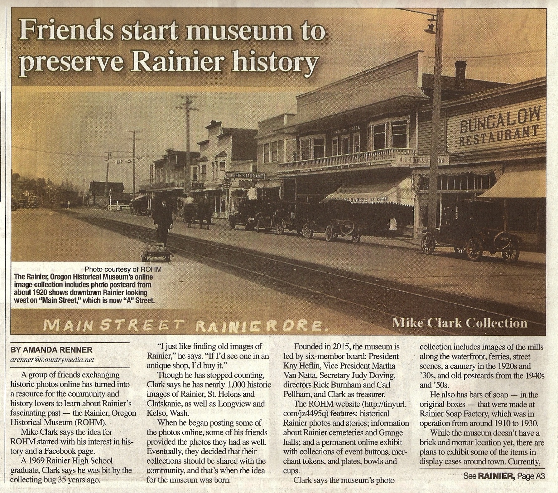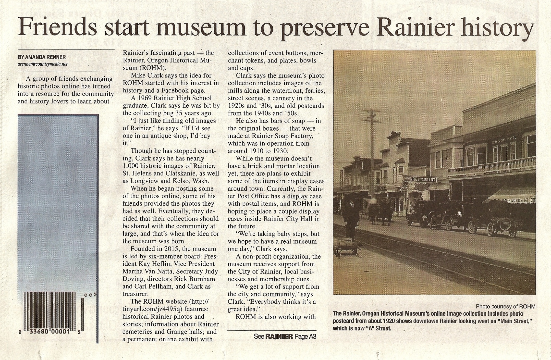 "Friends start museum to preserve Rainier history." Written by Amanda Renner for The Chronicle (St. Helens, OR) February 10, 2016. |