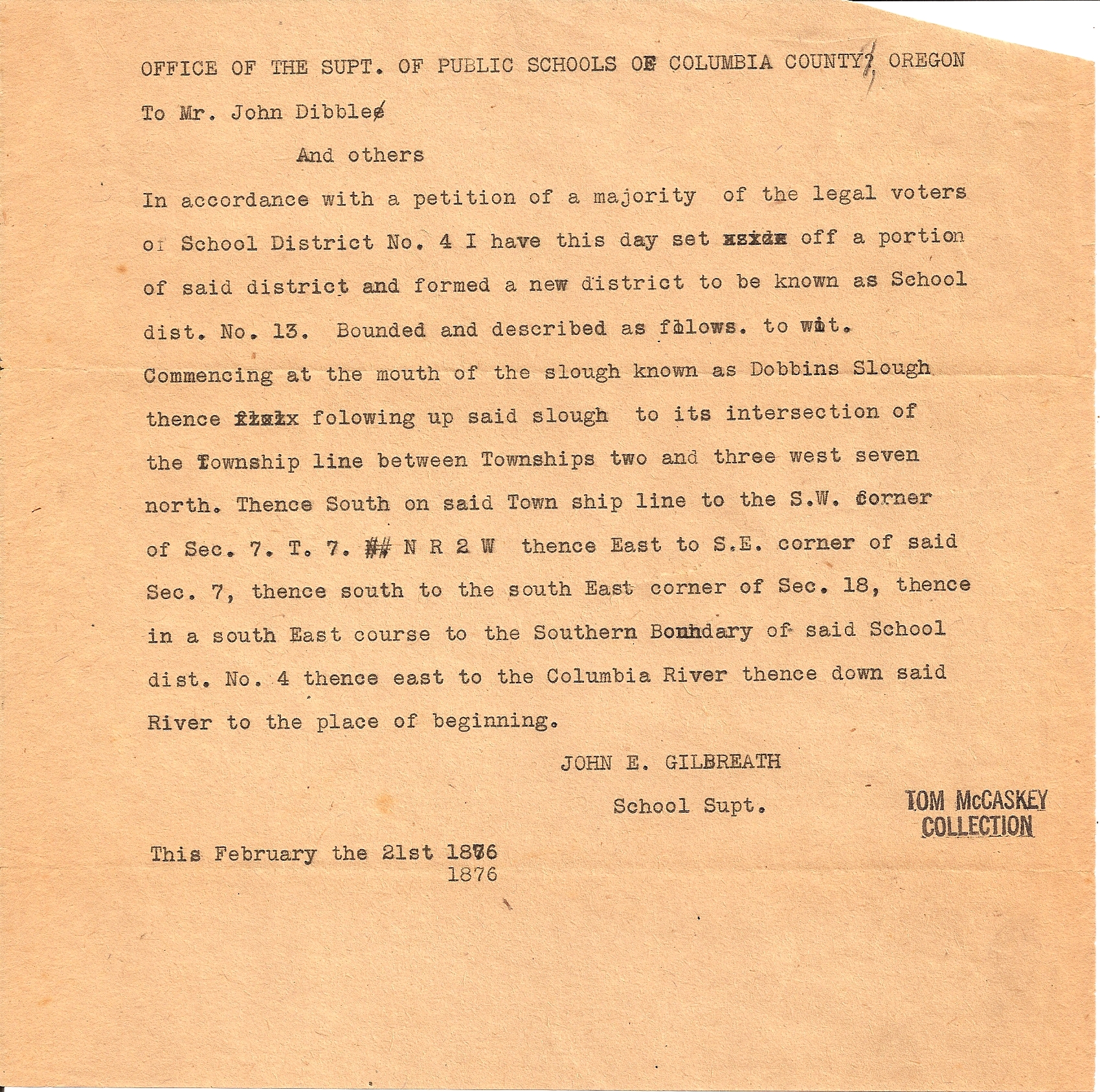 Rainier, Oregon's School District 13 birth certificate dated February 21, 1876. This is most likely a typed copy of the original. Courtesy of the McCaskey family.