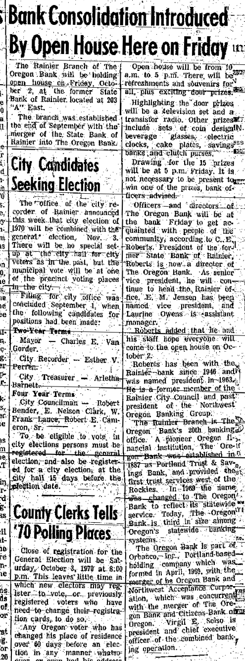 Article on the merger of the State Bank of Rainier into The Oregon Bank, from the October 1, 1970 issue of the Rainier (Oregon) Review. |