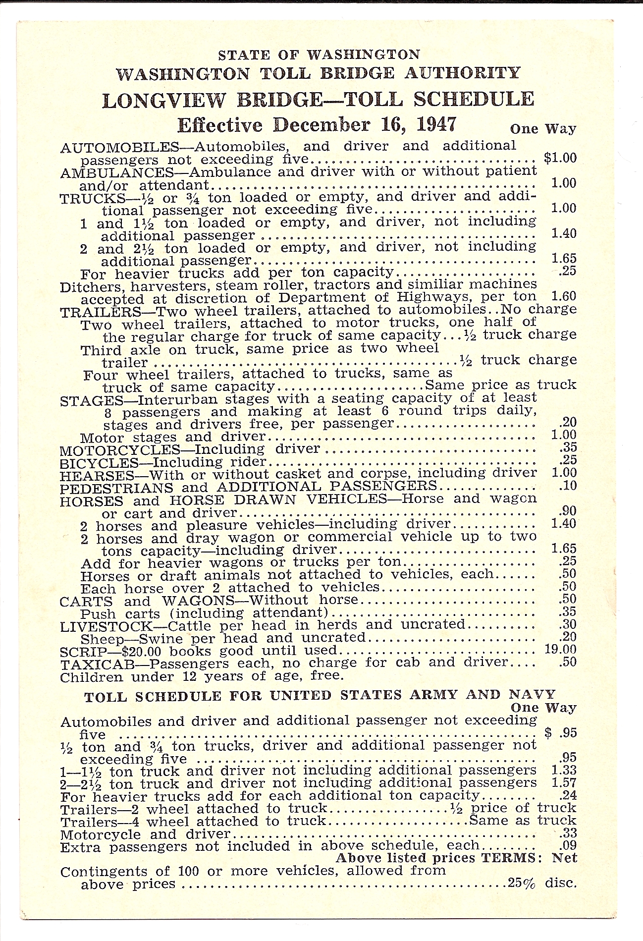 Longview Bridge Toll Schedule Effective December 16, 1947. |