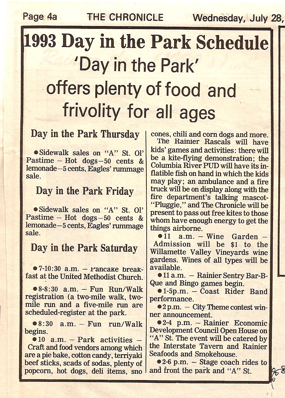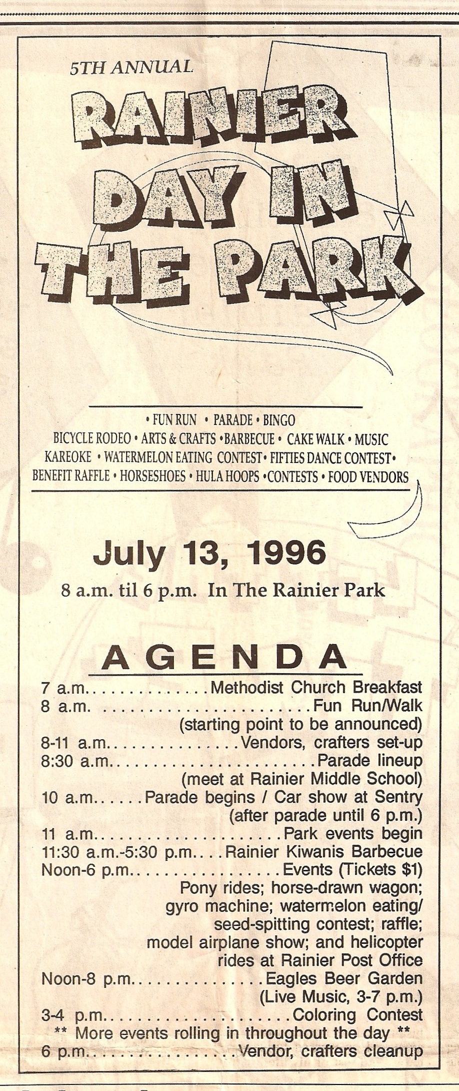Note: From 1992 through to 1997 it was just "Rainier Day in the Park" with only one day of activities scheduled, though sidewalk sales booths were sometimes opened a day or two before. The first known buttons to be produced was in 1998 with one design made into four different colors.