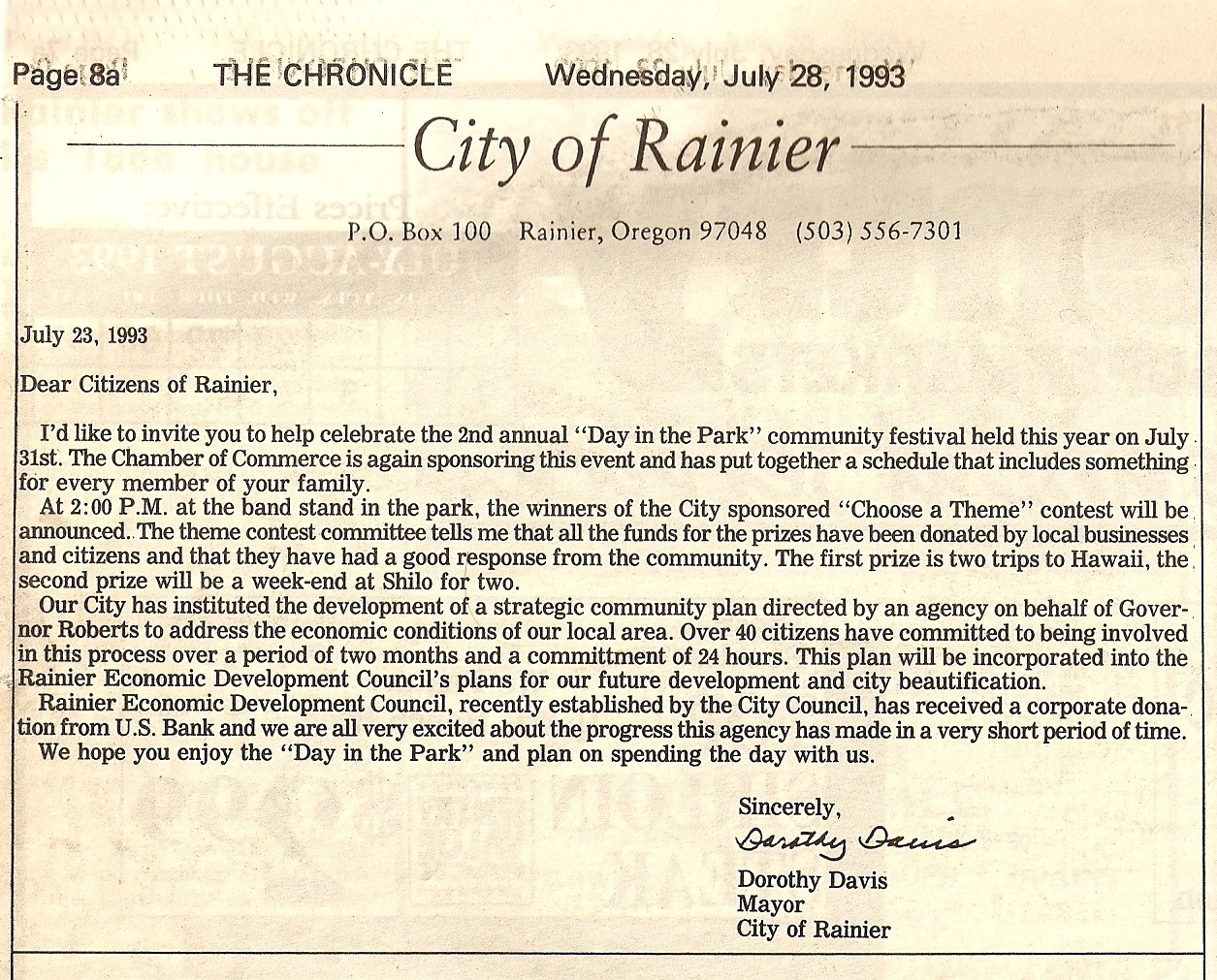 Open invitation to the 2th Annual 1993 Rainier Day In The Park by Dorothy Davis, the Rainier Mayor. From the July 28 issue of The Chronicle. |