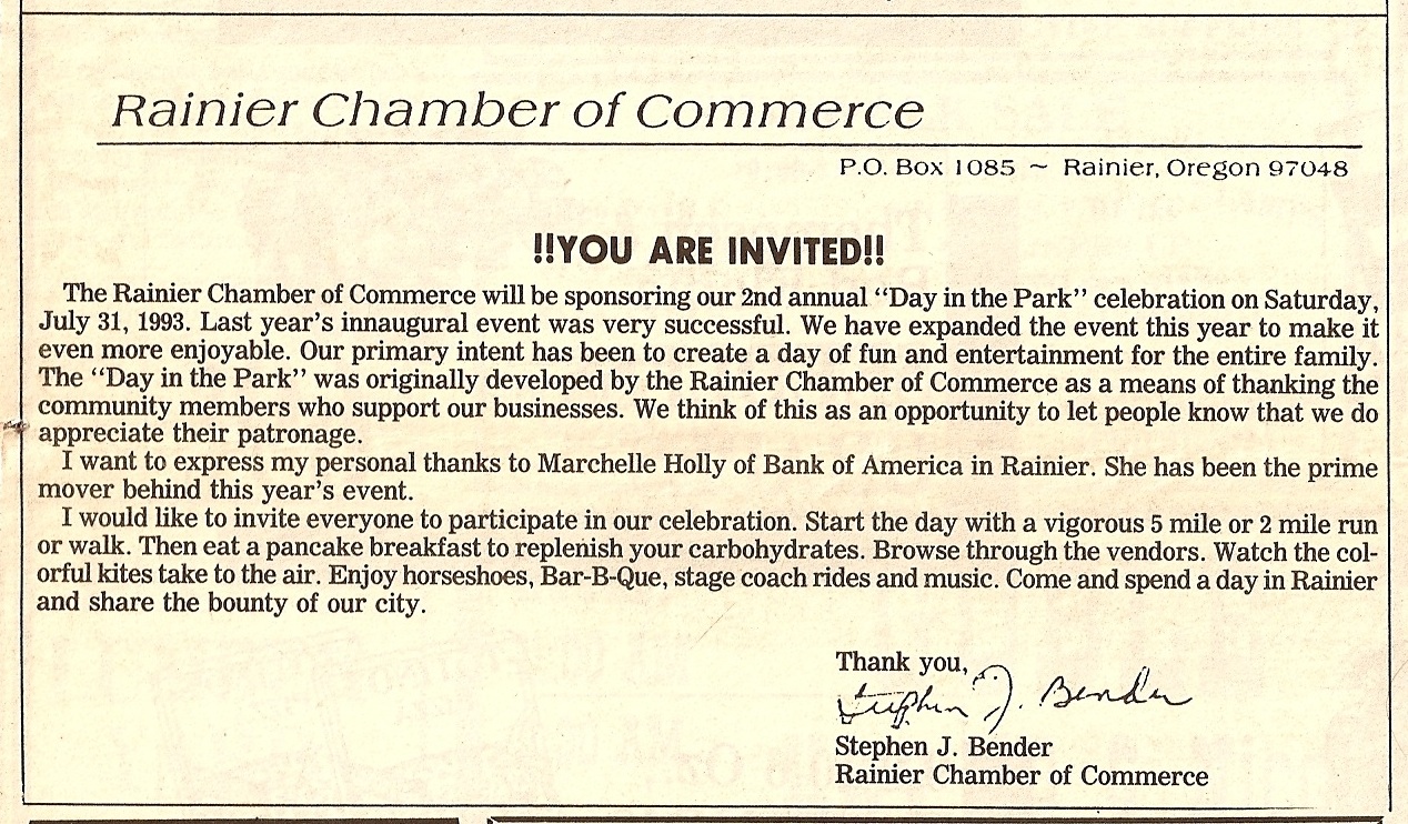 Open invitation to the 2th Annual 1993 Rainier Day In The Park by Stephen J. Bender with the Rainier Chanber of Commerce. From the July 28 issue of The Chronicle. |