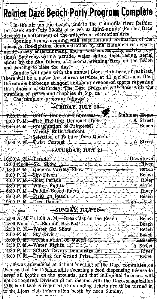 List of the 1962 Rainier Daze events (from the July 19 issue of the Rainier Review). |