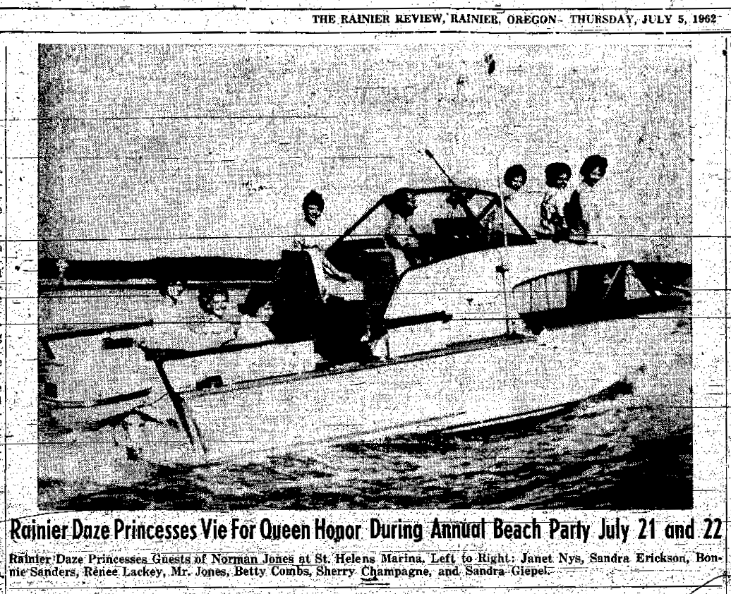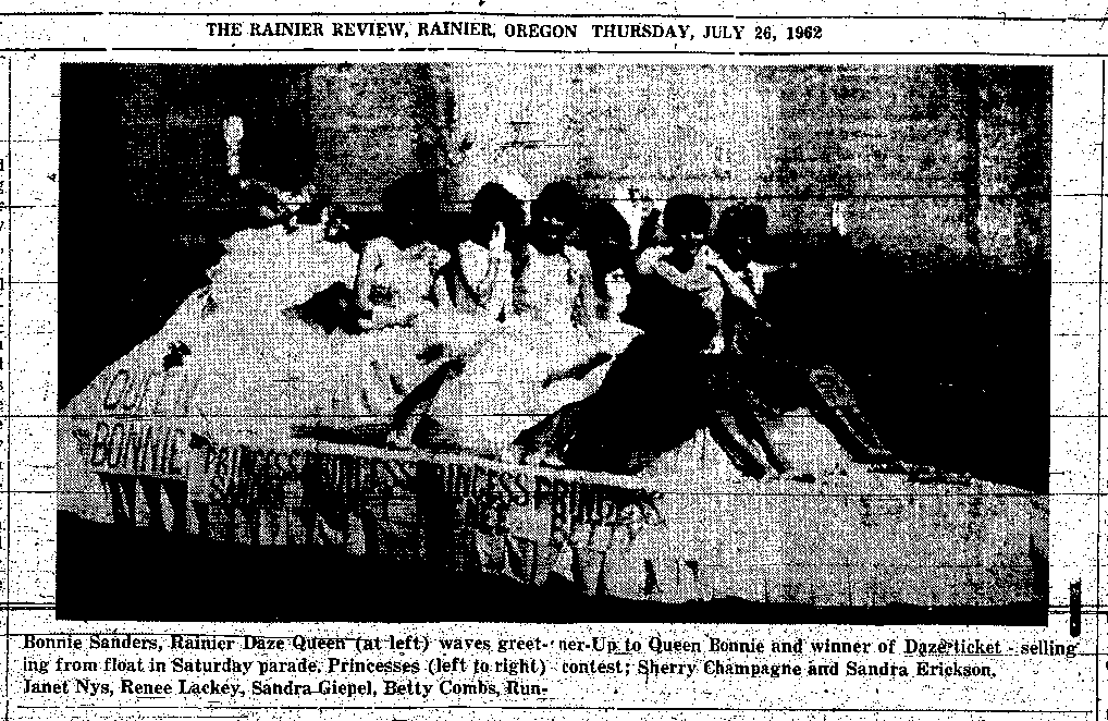 The 1962 Rainier Daze princesses were Sherry Champagne, Betty Combs, Sandra Erickson, Sandra Giepel, Renee Lackey, Janet Nys and Bonnie Sanders (from the July 5 issue of the Rainier Review). |
