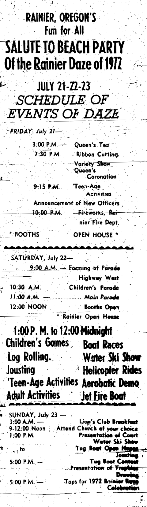 List of scheduled events from the July 20, 1972 issue of the Rainier Review. |