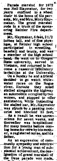Neil Slaymaker was chosen as parade marshal in the 1972 Rainier Daze parade (from Article in the July 27, 1972 Rainier Review). |