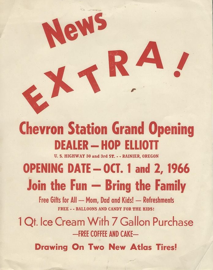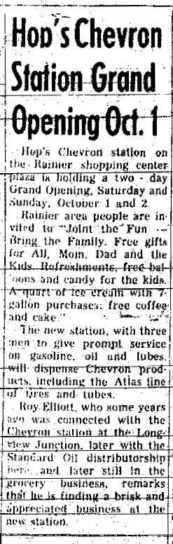 Newspaper article on Hop Elliot's Chervon Grand Opening, from the September 29, 1966 issue of the Rainier (Oregon) Reveiw. |