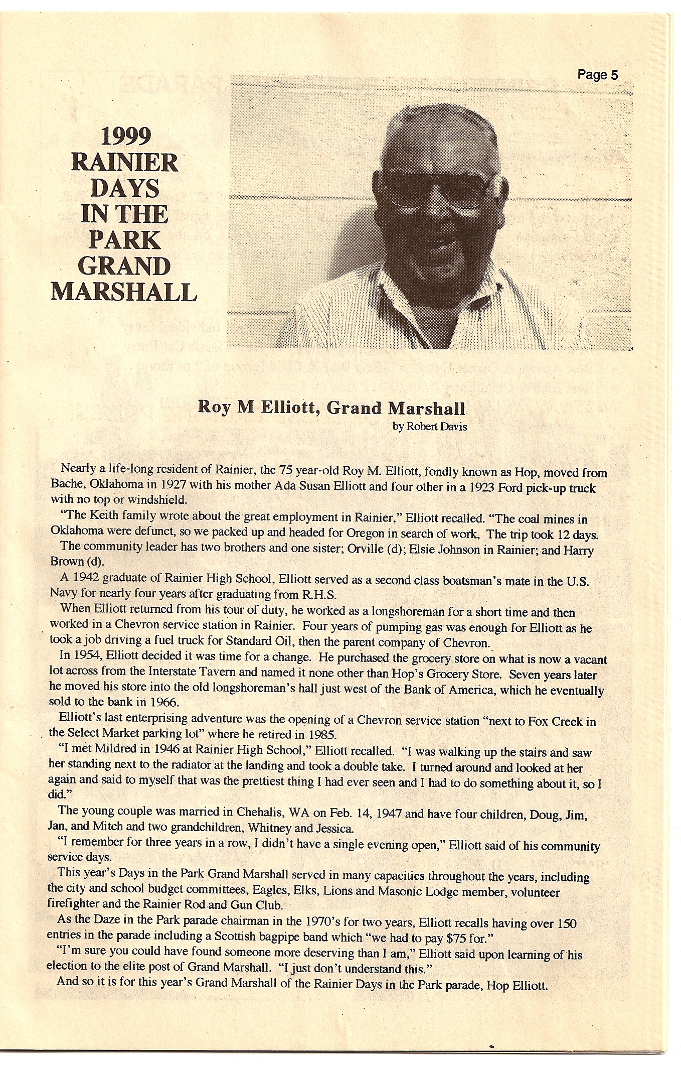 Article on Grand Marshall Roy M (Hop) Elliot from the 1999 Rainier Days in the Park event program booklet. |