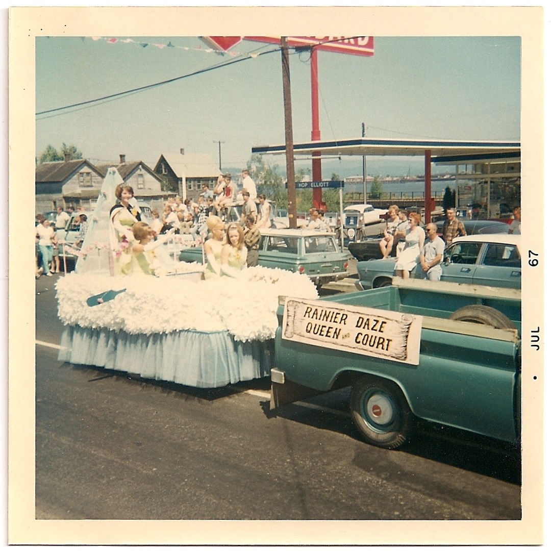 1967 Rainier Daze parade float with Queen Sheryle Gray and princesses Karen Turner, Barbara Leever and Kathy Johnson with Hop Elliott's Chevron Standard Station in the background. Photo provided by Eleanor Abraham. |