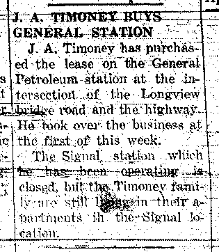 John Timoney purchases the lease on the General Petroleum station at the intersection of Longview bridge road and the highway. From the April 16, 1942 issue of the Rainier (Oregon) Reveiw. |