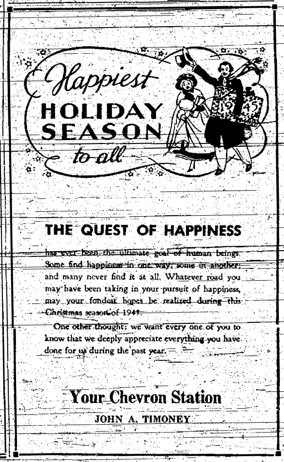 Your Chevron Station, John A. Timoney ad. From the December 20, 1945 issue of the Rainier (Oregon) Reveiw. |