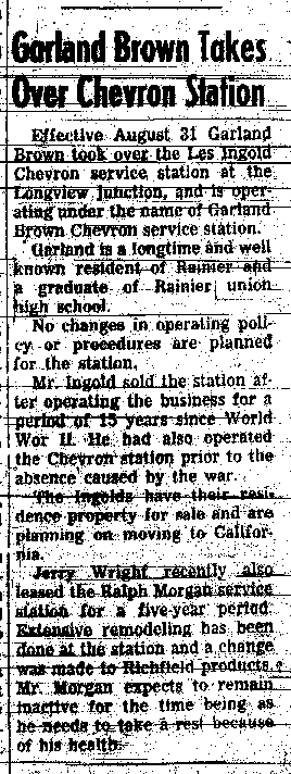 Garland Brown took over the Les Ingold Chevron service station effective August 31, 1960. From the September 8, 1960 issue of the Rainier (Oregon) Reveiw. |