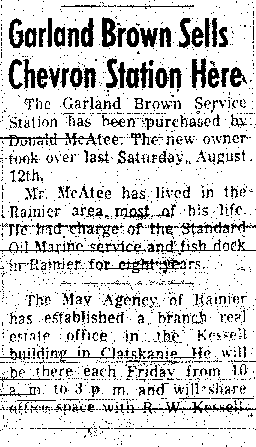 Garland Brown sold the Chevron service station to Donald McAtee. Mr. McAtee took over on August 12, 1961. From the August 17, 1961 issue of the Rainier (Oregon) Reveiw. |