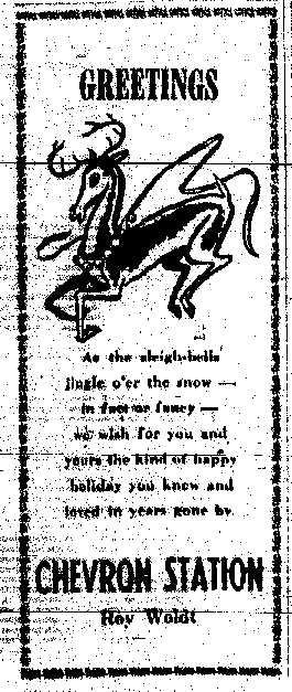 Chevron Station Christmas ad showing Roy Waldt as owner. From the December 21, 1961 issue of the Rainier (Oregon) Reveiw. |