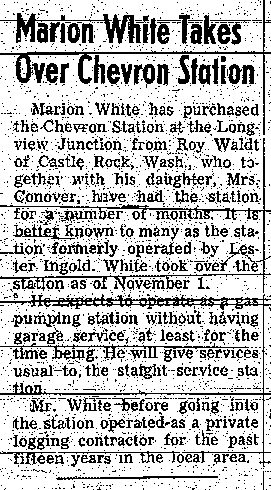 Marion White purchased the Chevron Station from Roy Waldt and took over operation on November 1, 1963. From the November 7, 1963 issue of the Rainier (Oregon) Reveiw. |